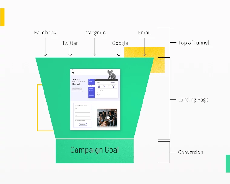 Seperti yang bisa dilihat pada diagram di atas, landing page berada di funnel tengah. Prosesnya adalah setelah audiens mengklik sebuah iklan digital, mereka akan langsung diarahkan ke sebuah halaman khusus berisi informasi lebih lanjut mengenai produk/jasa/campaign yang sebelumnya telah diklik.